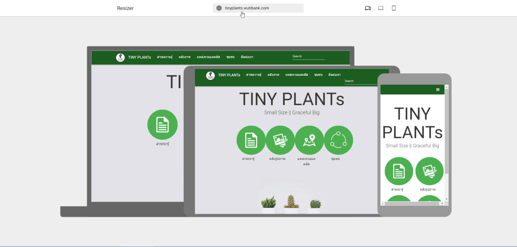 เว็บไซต์ออกแบบในรูปแบบ Flat Design, Card design เน้นความเรียบง่ายสบายตา พื้นหลังของหน้า Home ใช้ภาพที่เป็น Cinemagraph โดยตัวเว็บไซต์ประกอบไปด้วยเนื้อหาหลักๆคือ ข้อมูลเกี่ยวกับแคคตัส คลังรูปภาพแคคตัส ชุมชนแลกเปลี่ยนข้อมูลแคคตัส แนะนำสถานที่ขายและคาเฟ่แคคตัส เว็บไซต์ Tiny Plants จึงเหมาะสำหรับผู้ที่สนใจ Cactus ต้องการที่จะหาความรู้ทั้งสายพันธุ์วิธีการดูแลรักษา และแลกเปลี่ยนความรู้กับกลุ่มคนที่ชื่นชอบแบบเดียวกัน