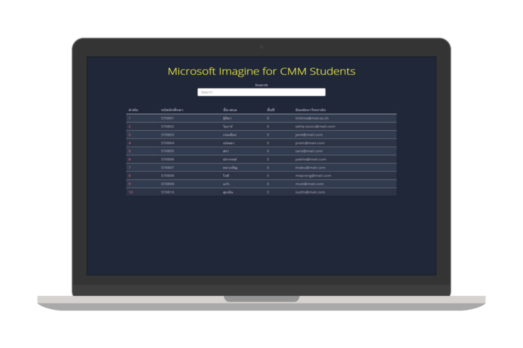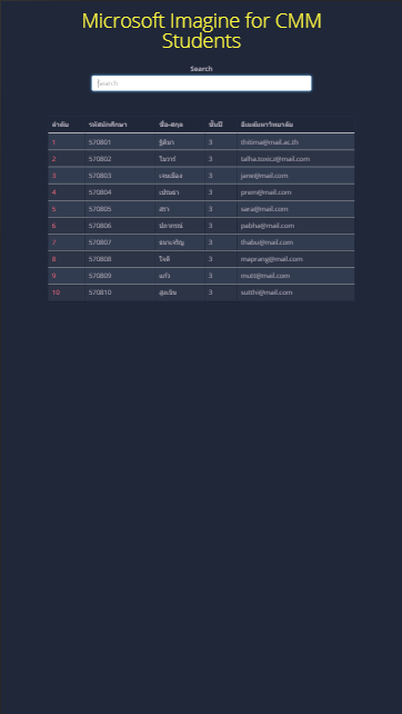 หน้าเพจแสดงรายชื่อของนักศึกษาที่ลงทะเบียนเข้าร่วมกิจกรรม Microsoft Imagine for CMM Students โดยใช้ JSON เป็นรูปแบบชุดข้อมูล